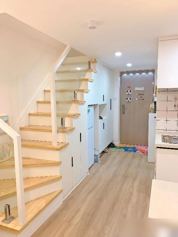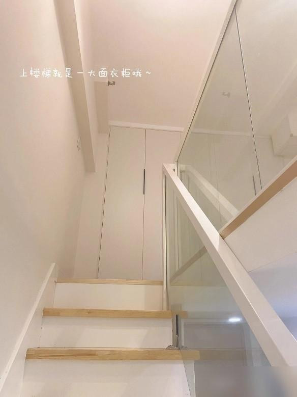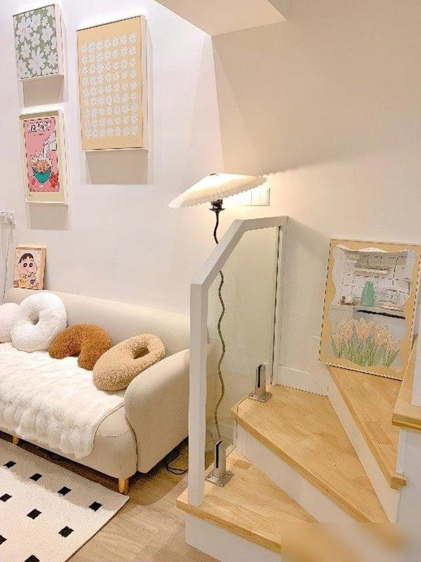 楼梯是“藏起来的收纳王”:选了实木踏板,脚踩上去暖乎乎的,像踩在客厅的木地板上;扶手用玻璃的,不挡光,阳光能从窗户钻进来,把整个空间照得亮亮的。最绝的是楼梯平台嵌了个大衣柜,装过季衣服和被褥,连“楼梯缝”都没放过——你看,连“垂直空间”都被她“榨干”了,这哪是楼梯,是“会走路的收纳柜”。