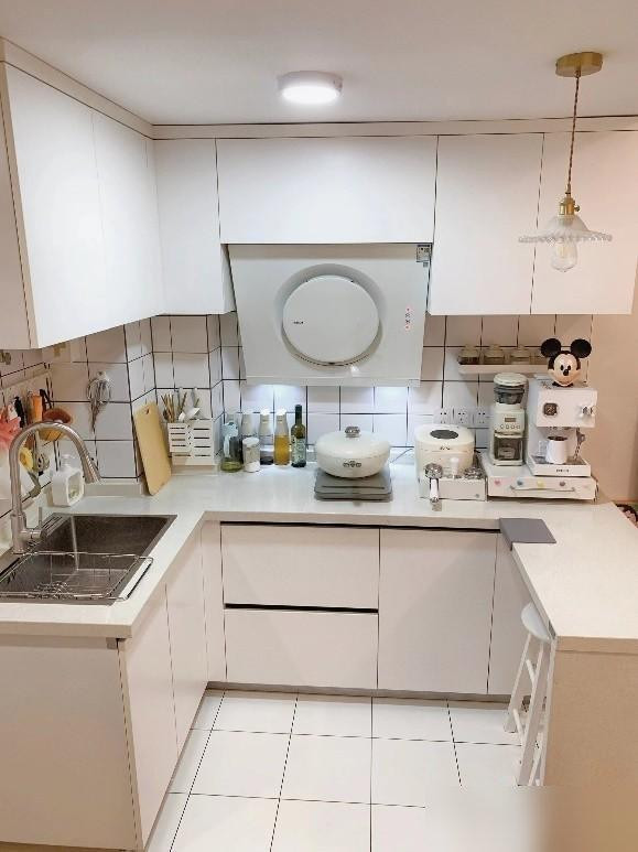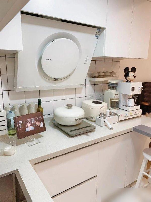 厨房更像“开挂现场”:做了U型台面,洗菜、切菜、炒菜顺得像开了倍速,连油烟机都选了小尺寸的,刚好嵌在墙里,吸走油烟的同时不占空间。最妙的是台面延伸成吧台,早餐啃面包、晚上煮泡面直接在这解决,省了餐桌的位置,还能边吃边看剧——谁能想到16㎡里藏着“小酒馆”既视感?她没买贵的厨具,却把“实用”刻进了每一块瓷砖:地板用白色小瓷砖,擦起油渍比大瓷砖方便10倍;墙面装了免打孔置物架,调料罐、锅铲全挂在眼前,不用翻柜子找——这姑娘怕不是“厨房细节控”转世?