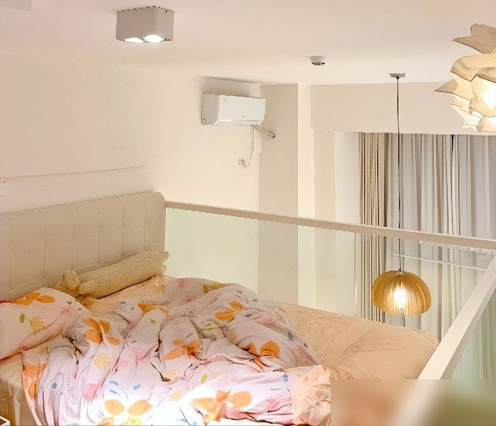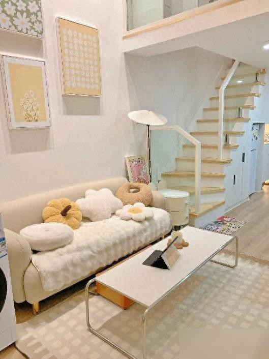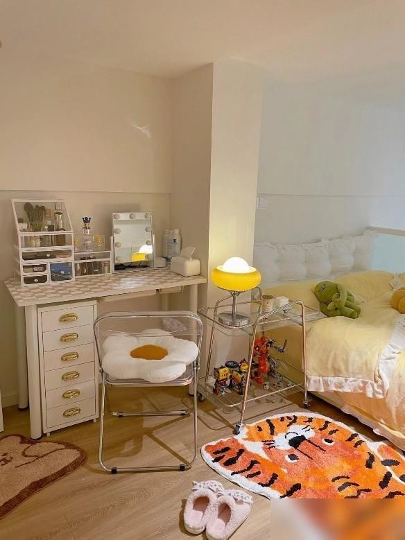 二楼的卧室才是“安全感天花板”:床紧挨着玻璃扶手,既能看到楼下的动静,又不会觉得闷;床边铺了块老虎纹毛绒地毯,光脚踩上去软得像踩在云里,晚上起夜也不怕凉脚。更妙的是隔出个小办公区,放台电脑就能加班,累了转身就躺床——比租的单间舒服100倍!她没买贵的床品,却把“温暖”缝进了每一根线:被褥选了浅色系,铺在床上像裹了层阳光;抱枕挑了碎花纹,添了点俏皮,连“小空间”都有了“大趣味”。
