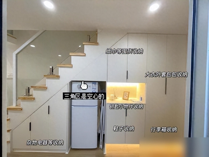 进门第一眼就懂她的“小心机”:玄关柜做了“分层魔法”——底部留空放常穿的鞋,不用蹲下来开柜门;中间挖个槽,钥匙、通勤包往那一扔,省得翻遍全身找;封闭柜塞行李箱、过季衣服,连楼梯底下的“死角”都变成了“收纳站”。更绝的是冰箱嵌在楼梯三角区,炒着菜想拿鸡蛋,走两步就到,比住大平层还省劲儿——这哪是装修,是把“生活动线”算到了骨子里。